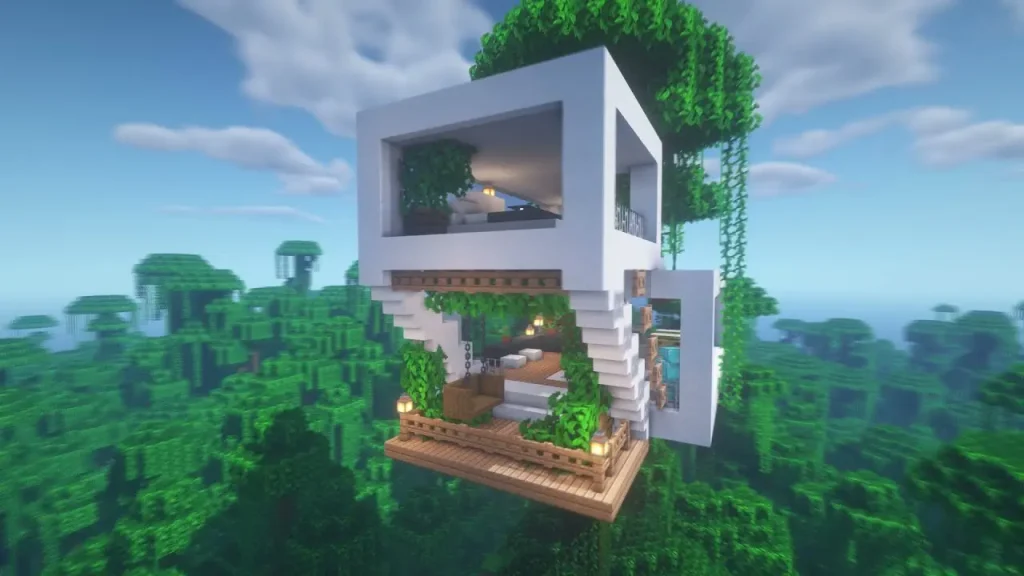 You reach the platform by climbing jungle vines, which is half the fun. The layout is compact and open with no doors or walls to break up the light. It’s modern Minecraft architecture that feels airy, elevated, and quietly expensive.