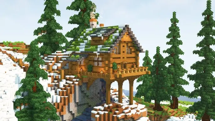 Built into the edge of a cliff, this wooden lodge is the kind of place you’d imagine renting for a long weekend away from civilization. The foundation sits on tall stone columns, lifting it above the mountain edge and giving it a full view of the snowy biome below.